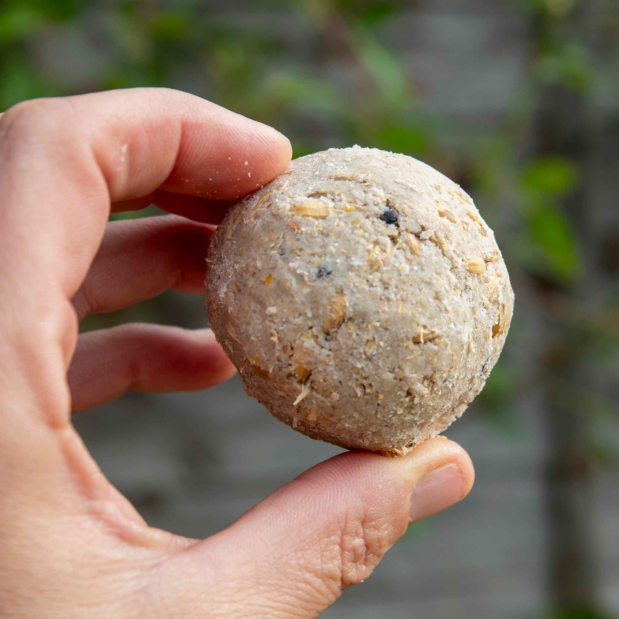 A natural source of calcium is added to standard fat balls to provide wild birds with a means to maintain healthy bones and eggs.