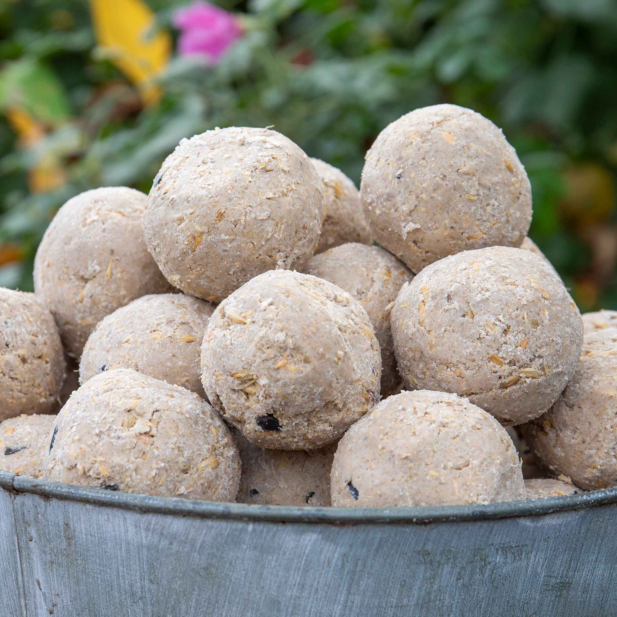 Cereals, oils & fats, minerals, seeds. Please note, occasionally (due to carriage and the fragile nature of the product) it can be common for up to 10% of fat balls to be broken at the bottom of the box, but don't worry as the birds still eat them.