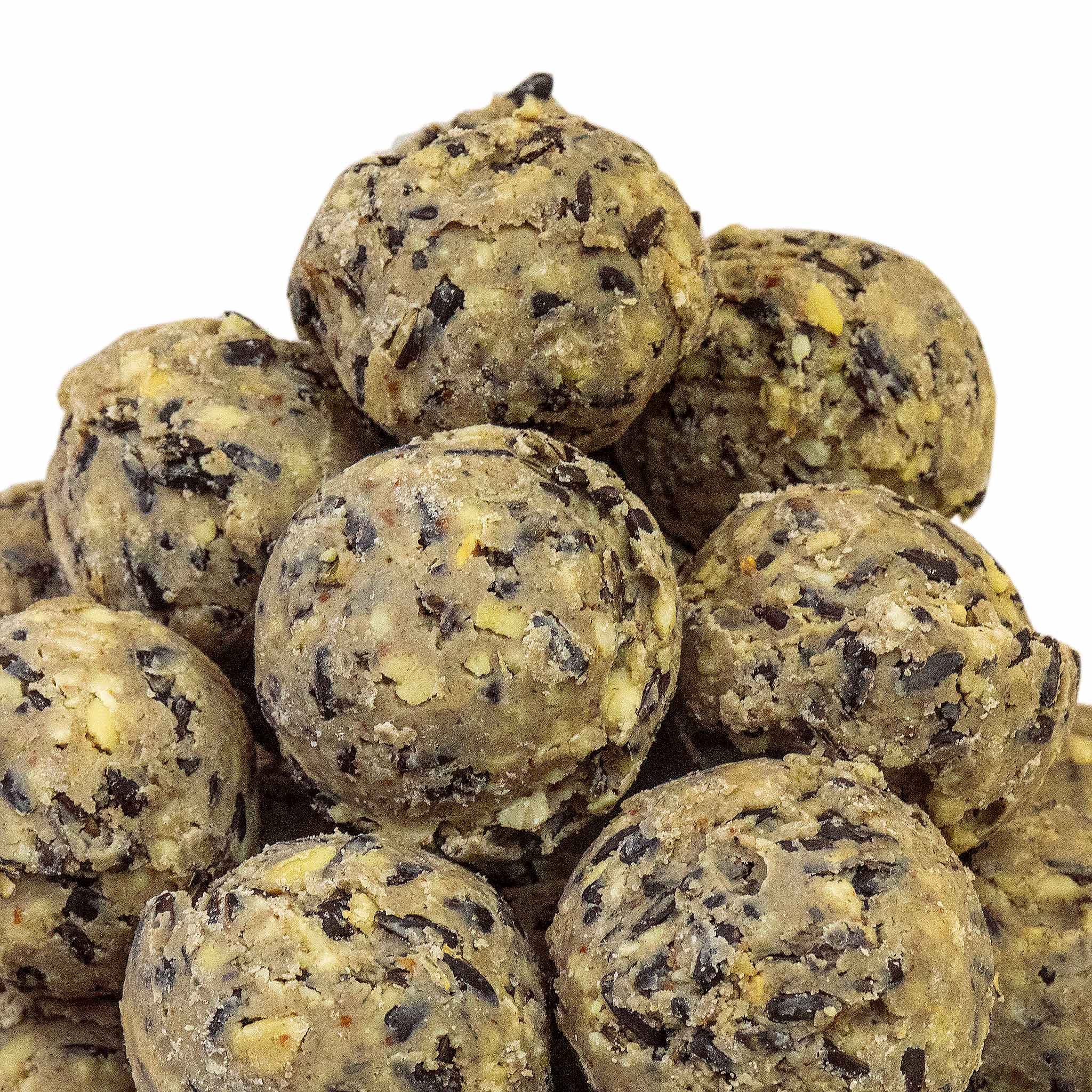 The Ultimate range Fat Balls contain 25% chopped nuts + 25 % Black Sunflower Seed ( chopped to help avoid fledglings taking large nut chunks and suffocating).