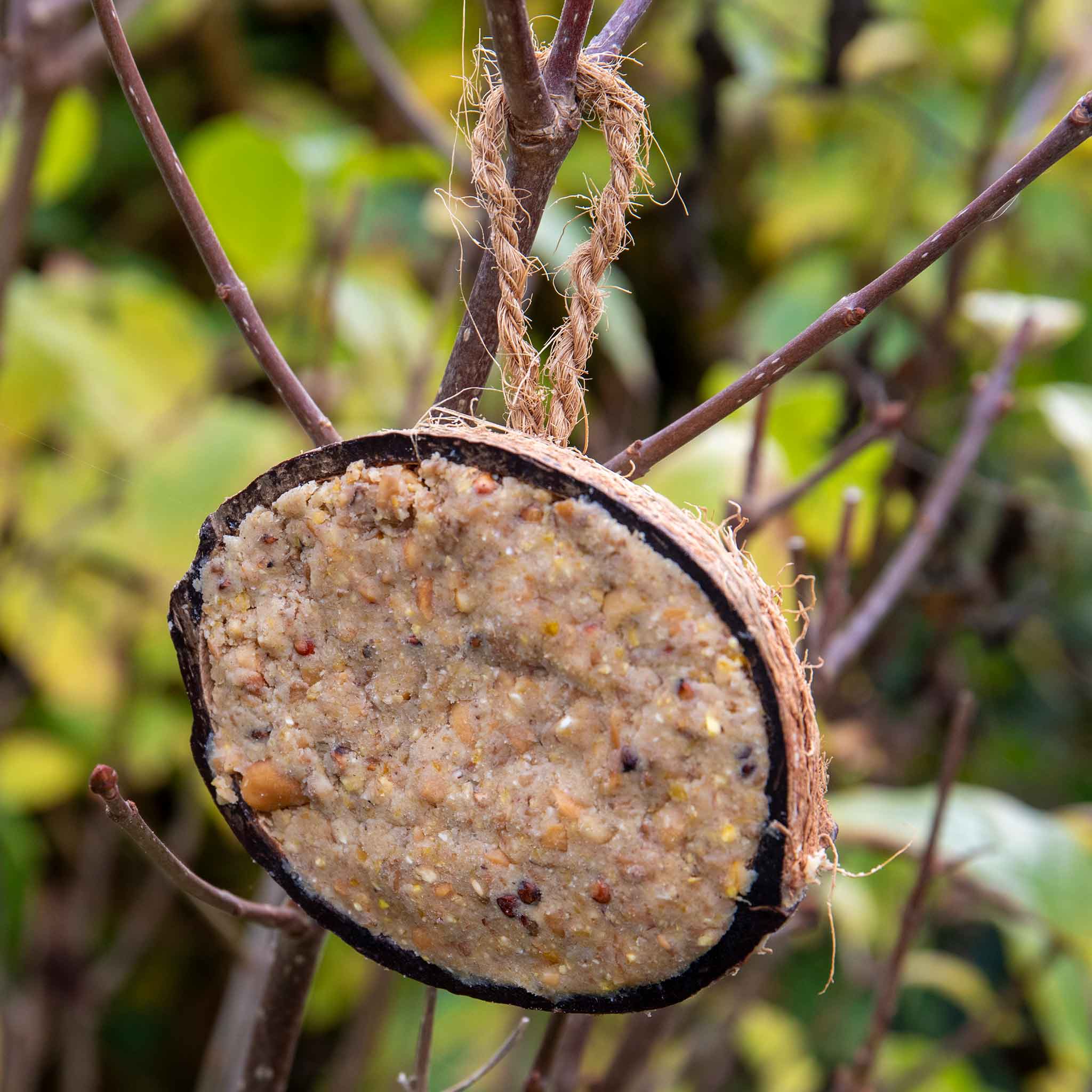 The birds love peanut utterly butterly and being able to buy in large quantities with the half coconut shells I find is the most economic way. Its easy to fill the shell and I find that every few weeks I fill all the shells I have which saves time in the mornings.
